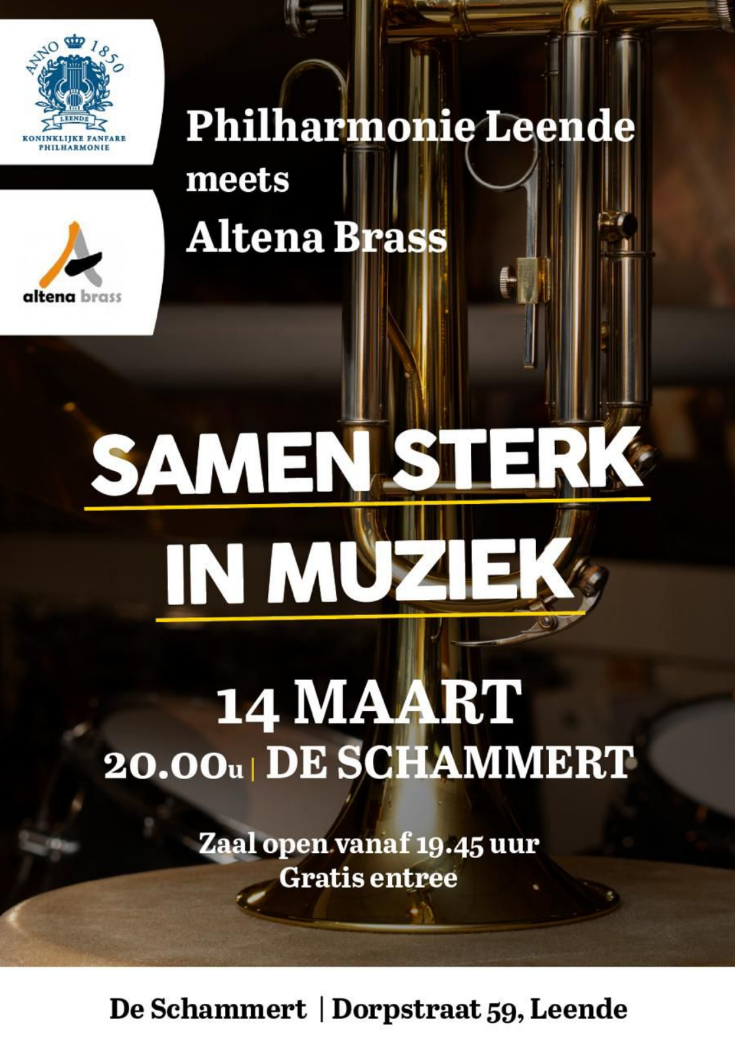 Op zaterdag 14 maart 2026 organiseert de Koninklijke Fanfare Philharmonie Leende een sfeervol uitwisselingsconcert met Brassband Altena Brass in De Schammert in Leende.